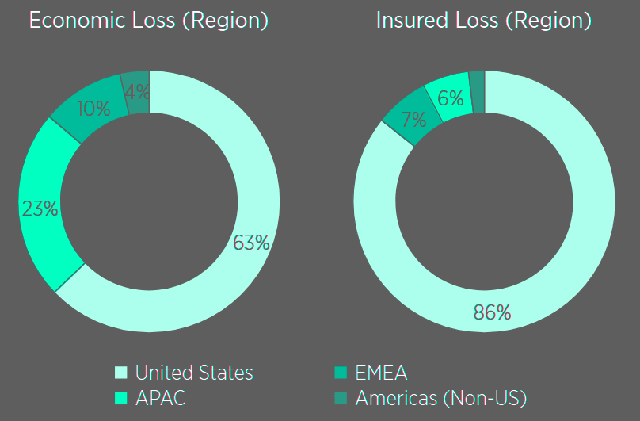 Науковий директор Gallagher Re Стів Боуен заявив, що рік виявився "асиметричним": лише п’ять подій забезпечили понад половину глобальних застрахованих втрат.