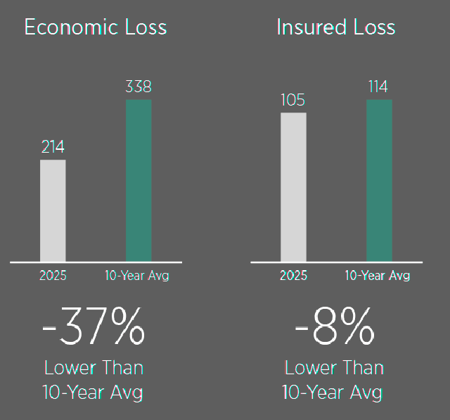 Глобальні збитки страховиків за 9 місяців 2025 року оцінюються у $105 млрд, що на 8% нижче середнього показника за останнє десятиліття. Та навіть це означає шостий рік поспіль із перевищенням позначки $100 млрд.