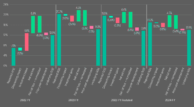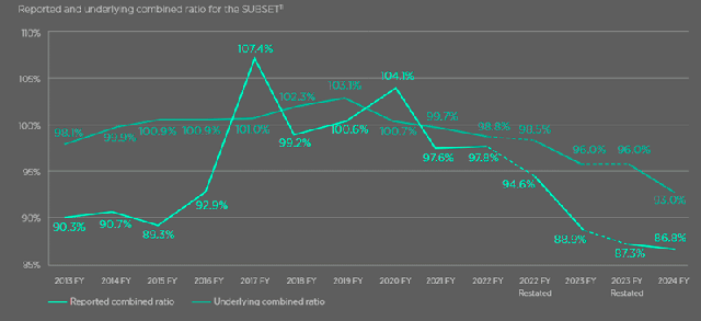 Вплив збільшення резервів попередніх років на комбінований коефіцієнт скоротився до 0.6% у 2024 році, що зумовлено зміцненням резервів Swiss Re на $2.6 млрд.