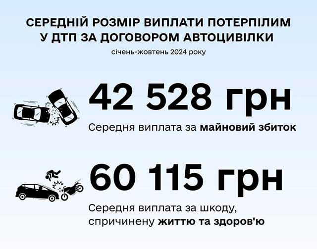 Середня виплата за майновий збиток у випадках, коли необхідний ремонт автомобіля або іншого пошкодженого майна, становить 42 528 гривень 30 копійок. Це на тридцять відсотків більше, ніж у відповідний період 2024 року, коли середнє значення дорівнювало 32 725 гривням 20 копійкам. Зростання пояснюється як подорожчанням запасних частин, так і підвищенням вартості робіт на станціях технічного обслуговування.