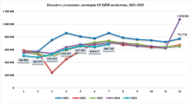 Зростання кількості договорів є частково "технічним" – в грудні 2024 року більше 420 тисяч автовласників додатково уклали договори "наперед" перед набранням чинності нового закону "Про ОСЦПВ", тому що всі розуміли, що його норми призведуть до дуже суттєвого зростання цін, і хотіли укласти договори за "старими", ще низькими цінами. Це дало зростання кількості договорів у грудні 2024 року на 64% – більше 1 млн договорів за місяць. Ця тимчасова ситуація призвела до падіння кількості укладання договорів у 1 кварталі 2025 року на 9%.