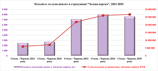 При аналізі Зеленої картки треба пам’ятати, що страхові платежі "прив’язані" до курсу євро, який за період з 01.07.2024 до 30.06.2025 змінився з 43,2658 до 48,7823 (на 12,8%), що дає падіння платежів у співставних цифрах вже на 14,5% (коригування на інфляцію дає аналогічну цифру – 14%).