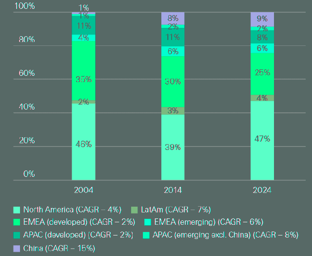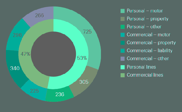 На ринках, що розвиваються, глобальний розподіл між комерційним (46%) та очікується, що особисті лінії (54%) збережуться, при цьому комерційне зростання буде зумовлене розширенням корпоративних ризиків, а особисті лінії будуть підтримуватися наздоганяючим проникненням автомобілів на ринках, що розвиваються.