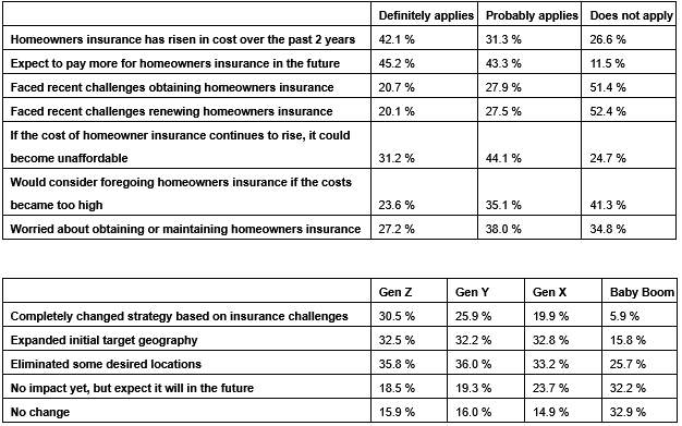 Ті, хто шукає житло покоління Z, частіше вживають заходів під час пошуку, щоб потенційно пом'якшити проблеми зі страхуванням власників житла, порівняно з іншими поколіннями, особливо бебі-бумерами, які заявили, що лише 6 відсотків повністю змінили свою стратегію купівлі житла, і лише 15 відсотків розширили свій початковий пошук.