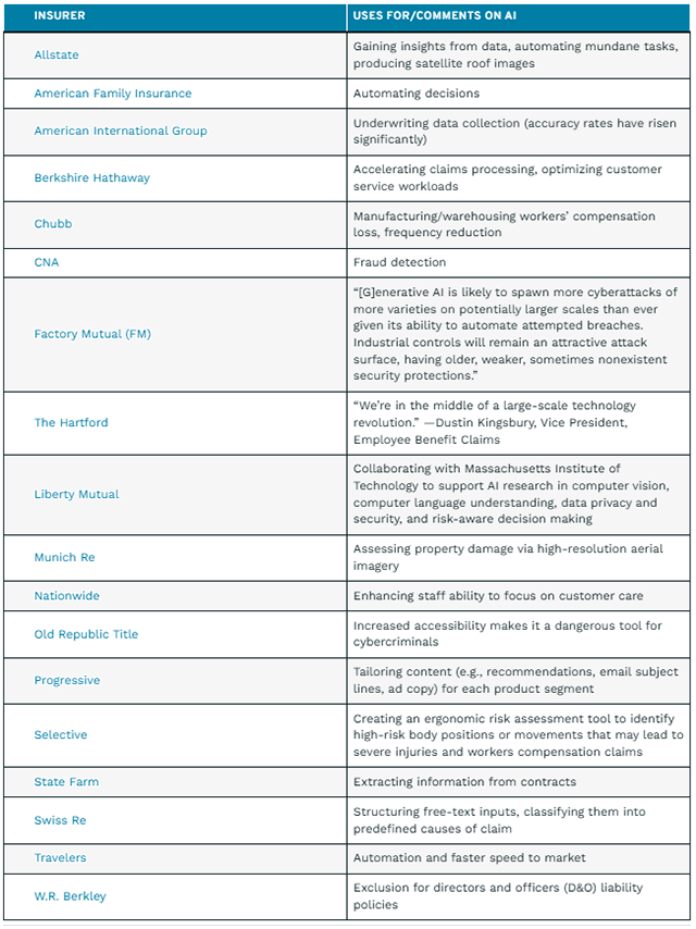 Аналіз розкриття інформації від 18 найбільших страховиків майна та від нещасних випадків показує, що вони використовують штучний інтелект для багатьох функцій, а не лише для андеррайтингу та страхових випадків.