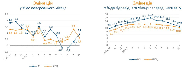 Інфляція на споживчому ринку в жовтні 2025 порівняно з вереснем становила 0,9%, із жовтнем 2024 – 10,9%. Базова інфляція в жовтні 2025 порівняно з вереснем становила 0,6%, із жовтнем 2024 – 10,2%. Про це йдеться в даних Держстату.