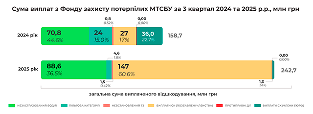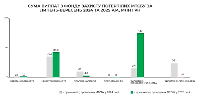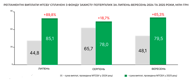 За липень-вересень 2025 року МТСБУ здійснило 4 487 регламентні виплати з Фонду захисту потерпілих на загальну суму 242,7 млн грн. У порівнянні з аналогічним періодом 2024 року кількість виплат зросла на 162%, а сума виплат – на 155%.