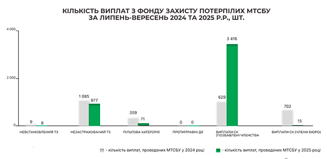 Більшу частину регламентних виплат у липні–вересні 2025 року становили відшкодування за зобов’язаннями страховиків, які припинили членство в МТСБУ. Зростання таких виплат пов’язане з впровадженням Закону №3720-IX, який уповноважує МТСБУ здійснювати виплати за зобов’язаннями колишніх членів Бюро – незалежно від формальних процедур банкротства страховика.