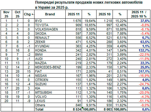 Так, за данними AUTO-Consulting, лідером вже котрий місяць є китайський виробник BYD, але у листопаді він встановив черговий рекорж і майже досяг 20% частки на ринку. Тобто, кожен п'ятий новий автомобіль у жовтні – це вже був BYD.