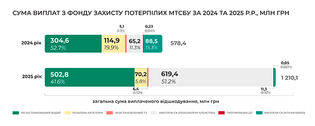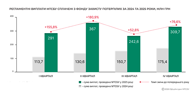 У 2025 році МТСБУ здійснило 21 035 регламентних виплат із Фонду захисту потерпілих на загальну суму понад 1,2 млрд грн. Порівняно з 2024 роком кількість виплат зросла на 107,8%, а загальний обсяг виплат – на 109,2%. Слід зазначити, що наведені показники сформовані без урахування врегулювань у межах механізму прямого врегулювання страхових випадків.