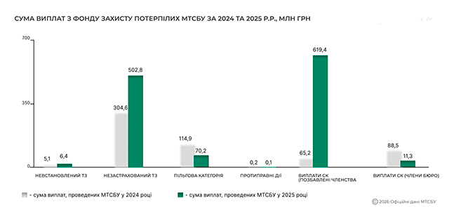 Зростання обсягів таких виплат є прямим наслідком набуття чинності Закону України №3720-ІХ, який запровадив новий, більш ефективний механізм компенсацій. Відтепер МТСБУ може оперативно відшкодовувати збитки за зобов’язаннями страховиків, виключених із Бюро, без необхідності очікувати судового рішення про банкрутство, як це було раніше. Ці законодавчі зміни суттєво прискорили процес виплат та посилили захист прав потерпілих у ДТП. Постраждалі отримують компенсацію вчасно навіть у випадках, коли винуватець був застрахований у компанії, яка припинила членство в МТСБУ або не виконує своїх зобов’язань.
