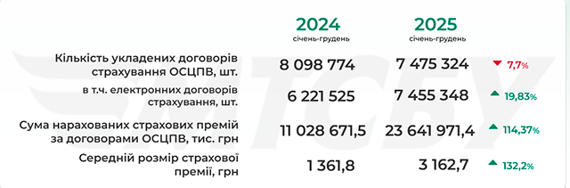 За 2025 рік загальна сума нарахованих страхових премій за внутрішніми договорами ОСЦПВ склала 23,6 млрд грн, що на 114,4% перевищує показник аналогічного періоду минулого року.