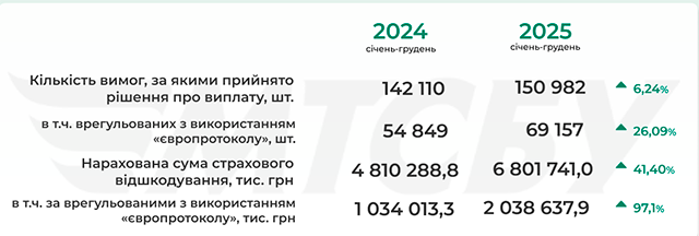 Загальний обсяг страхових виплат за цими випадками у січні-грудні 2025 року перевищив 2 млрд грн, що на 97,1% більше, ніж за аналогічний період попереднього року. Середній розмір відшкодування становив 29 478,4 грн проти 18 852 грн у 2024 році. Суттєве зростання обсягів виплат за Європротоколом зумовлене як підвищенням популярності цього механізму врегулювання ДТП, так і скасуванням у 2025 році обмеження максимального розміру страхової виплати.