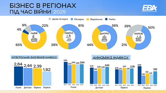 Щодо ситуації в усіх чотирьох регіонах, то вона дещо покращились. Інтегральна оцінка індексу склала у Львові – 2,64 бала (2,62 у 2024 році), у Дніпрі – 2,44 бала (2,20), в Одесі – 2,39 бала (2,15) та у Харкові – 1,92 бала (1,45). Умови ведення бізнесу компанії переважно оцінюють як складні і тільки на заході більшість компаній вважають їх задовільними.