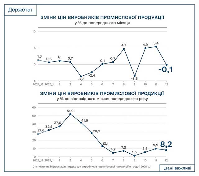 За підсумками минулого року ціни виробників промислової продукції зросли на 8,2%. Попри значні коливання протягом року, грудень 2025-го продемонстрував стабілізацію та навіть незначне зниження цін на 0,1% порівняно з листопадом. Про це свідчать дані Державної служби статистики.